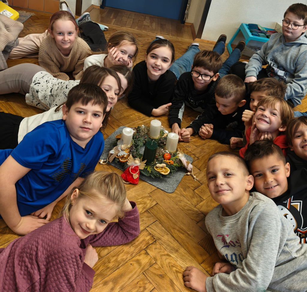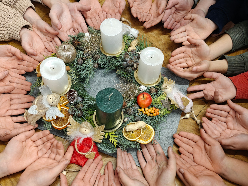 Die Schüler:innen gestalten gemeinsam den Adventskranz für die Klasse 3a.